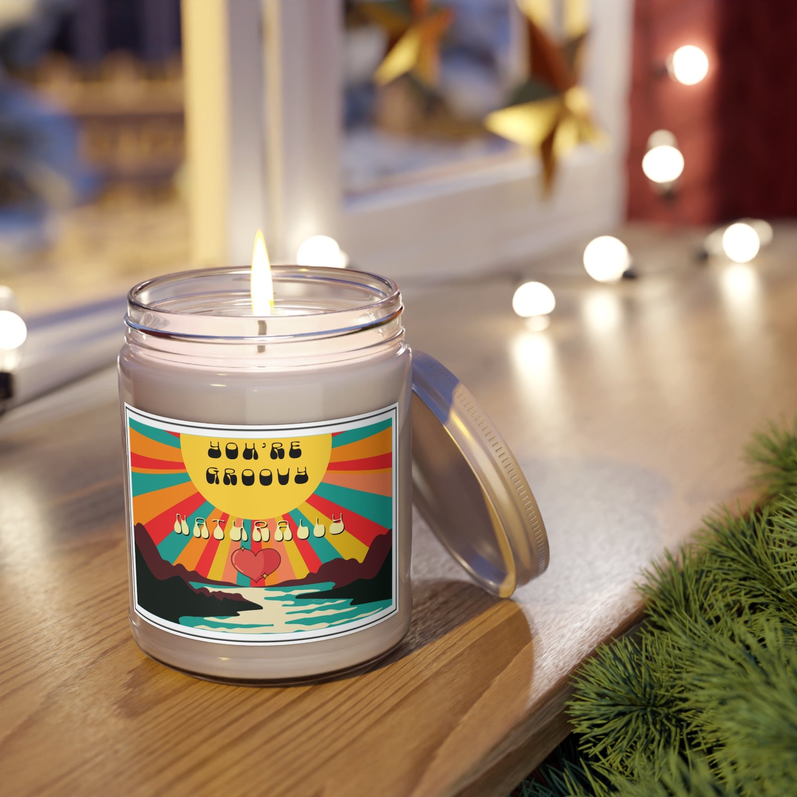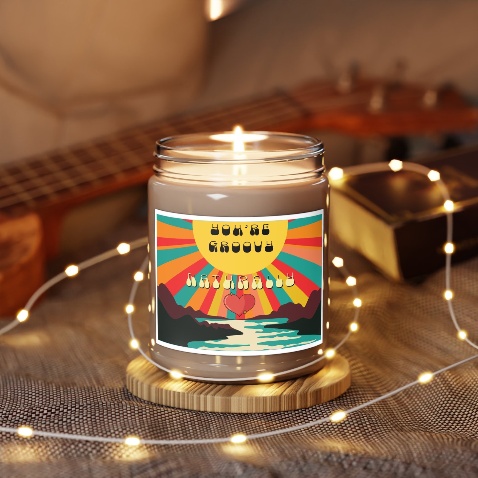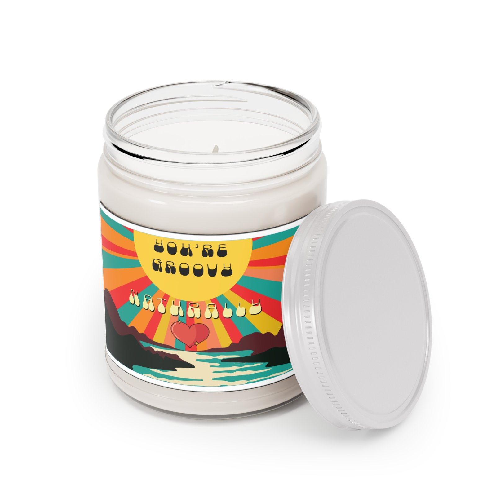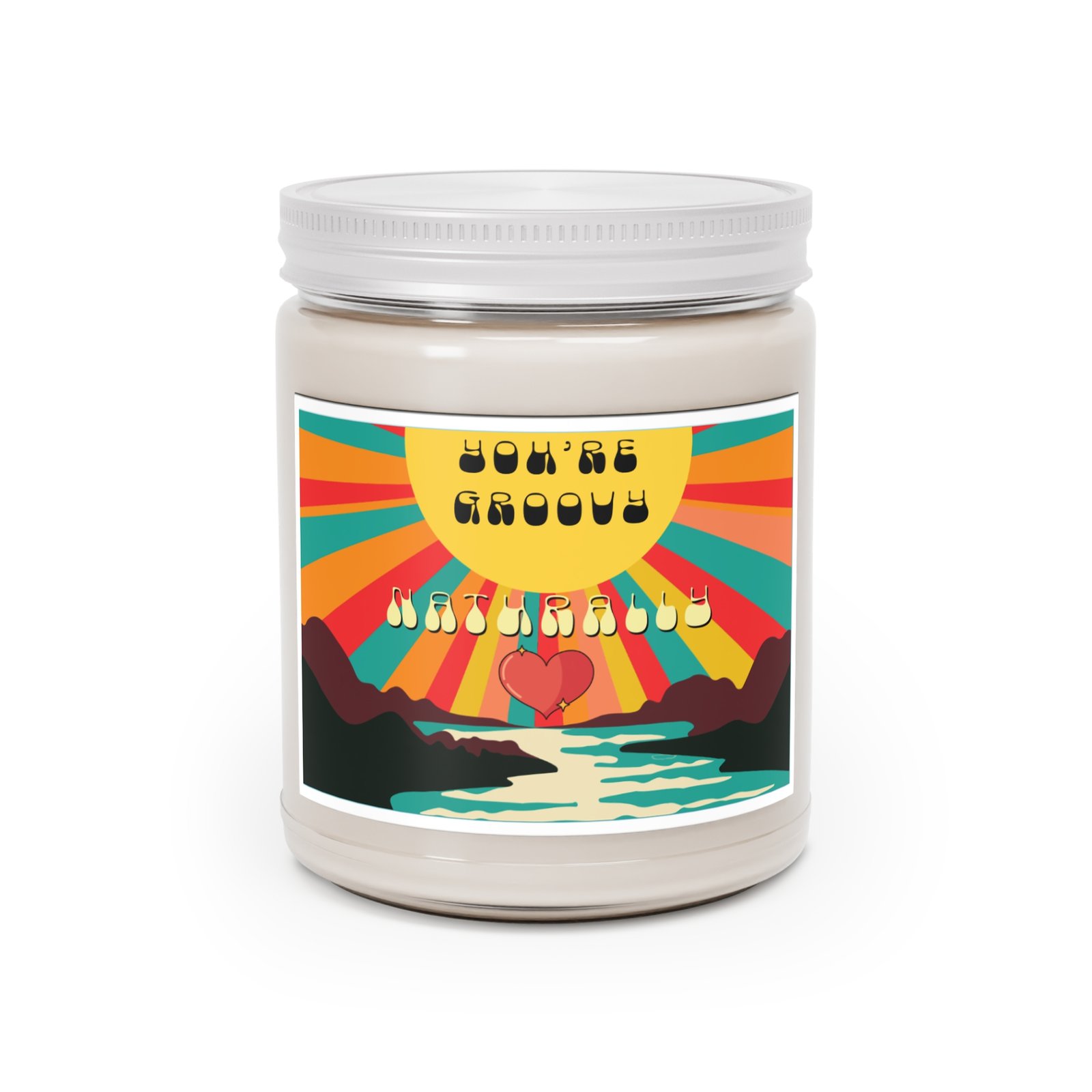 Ignite your inner sunshine with this hand-poured 9 oz soy candle, designed to infuse your space with warmth, whimsy, and a touch of nostalgia. Housed in a reusable clear glass jar with a crisp white lid, this candle features a groovy label bursting with retro charm: radiant sunbeams, a winding river, and a heart nestled between stylized mountains — a visual love note to soulful living.