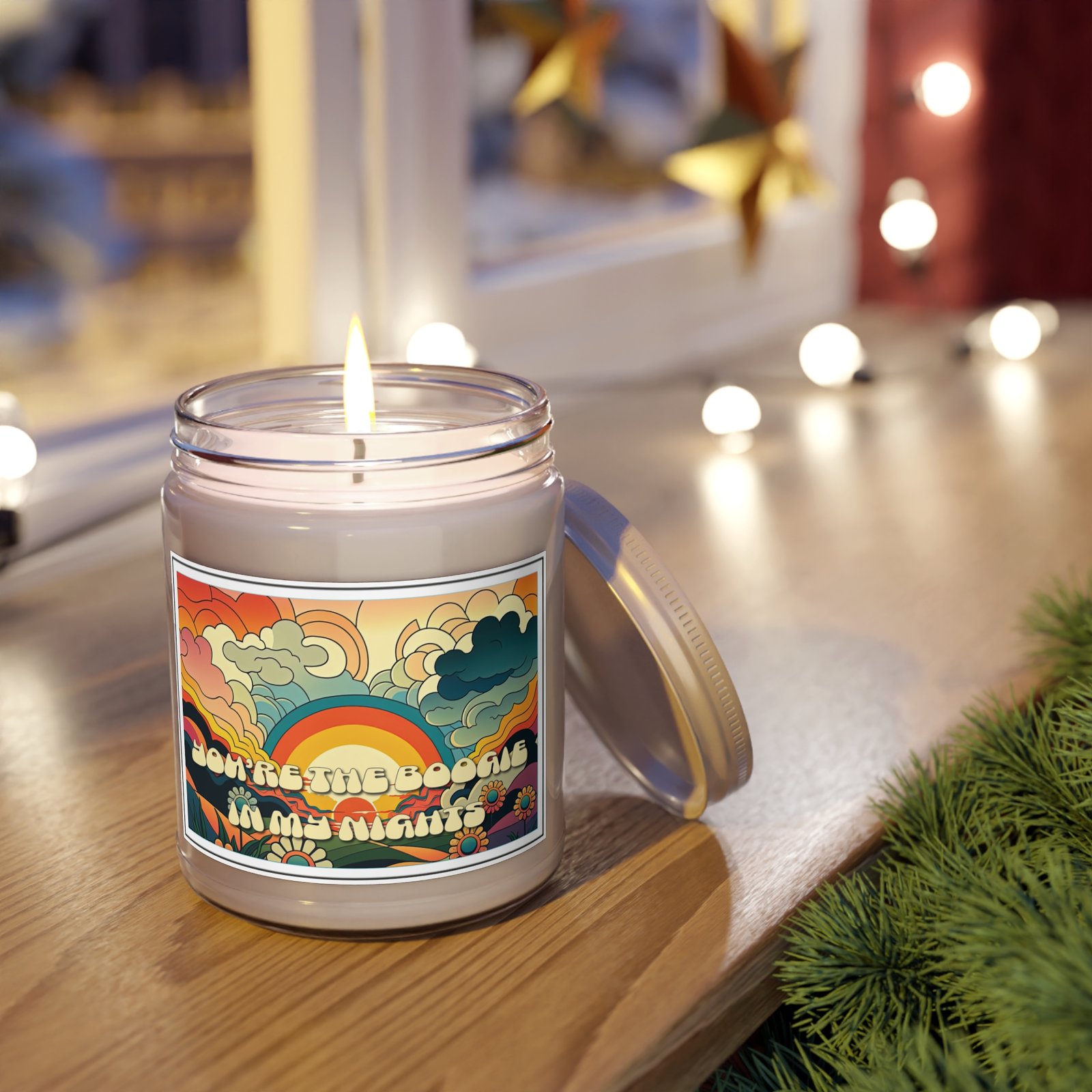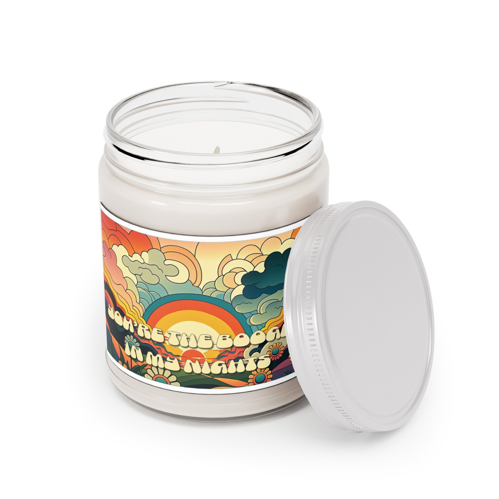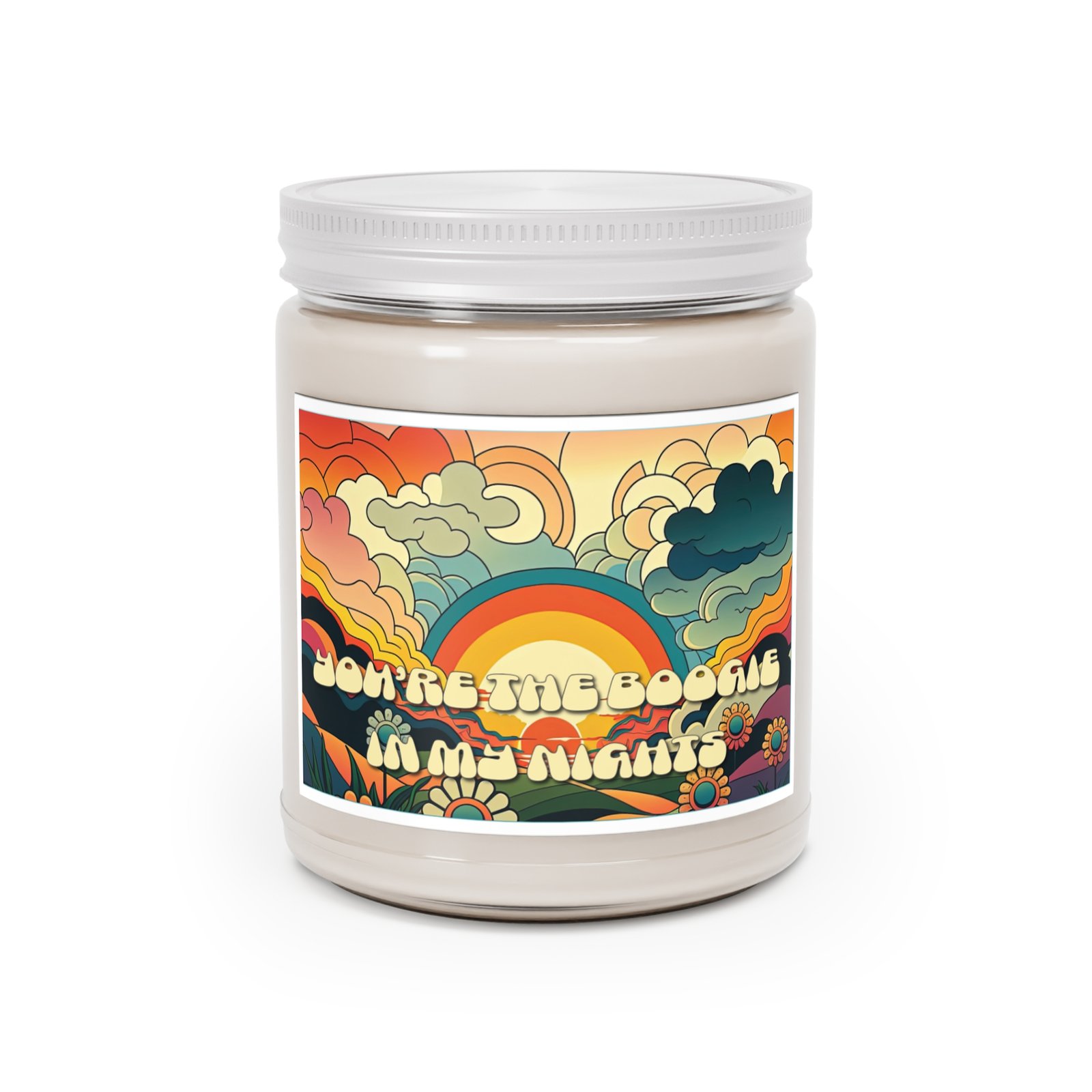 A retro sunset soy candle for the quiet thrill of connection — hand-poured with care and wrapped in a retro label that swirls sunset skies, soft hills, and blooming florals into one warm embrace. The phrase “You’re the Boogie in My Nights” adds a wink of vintage charm, perfect for those who move through life with rhythm and heart.