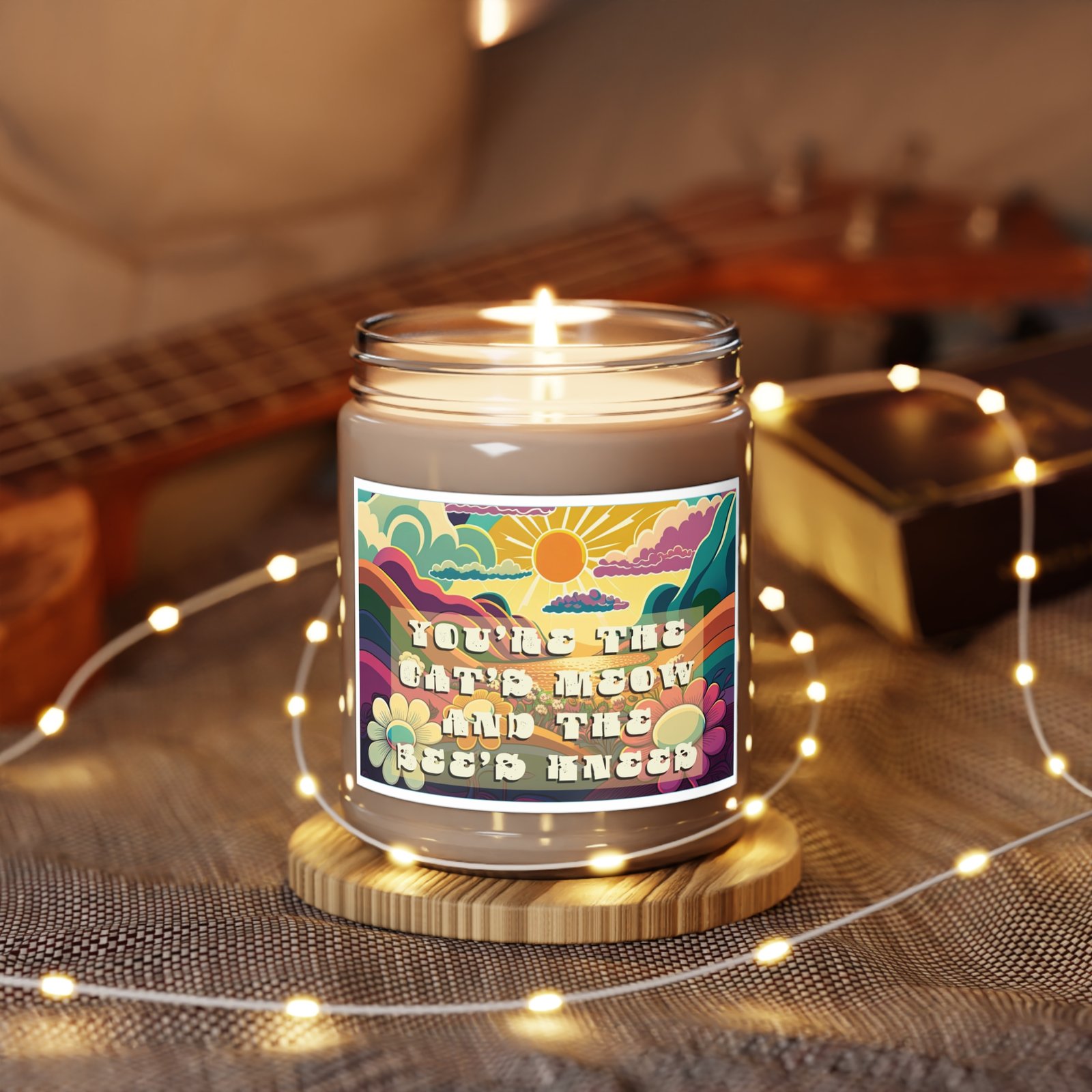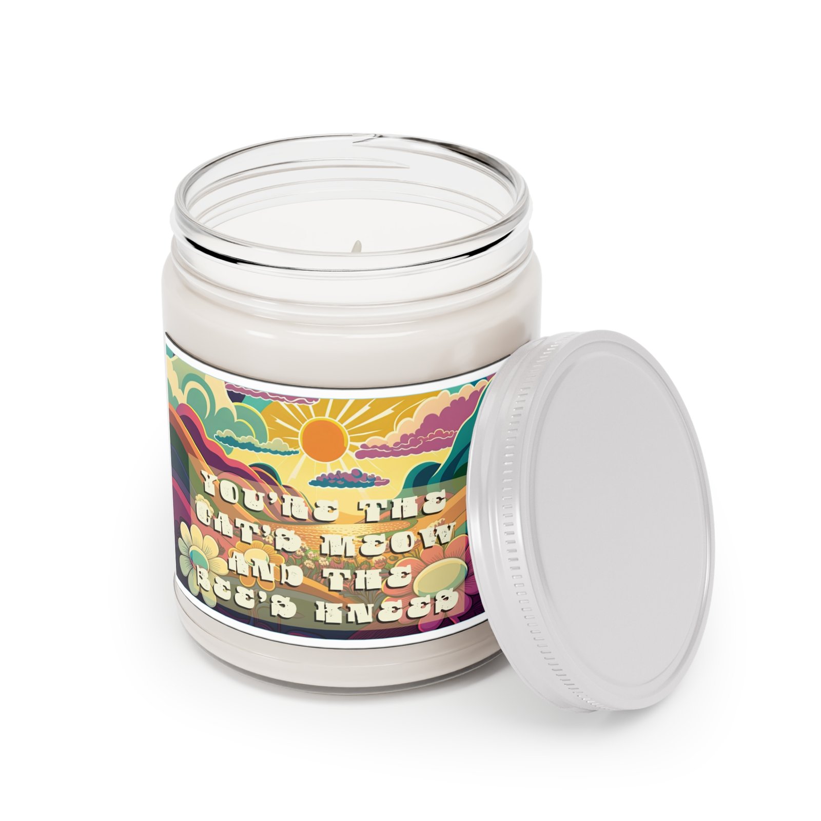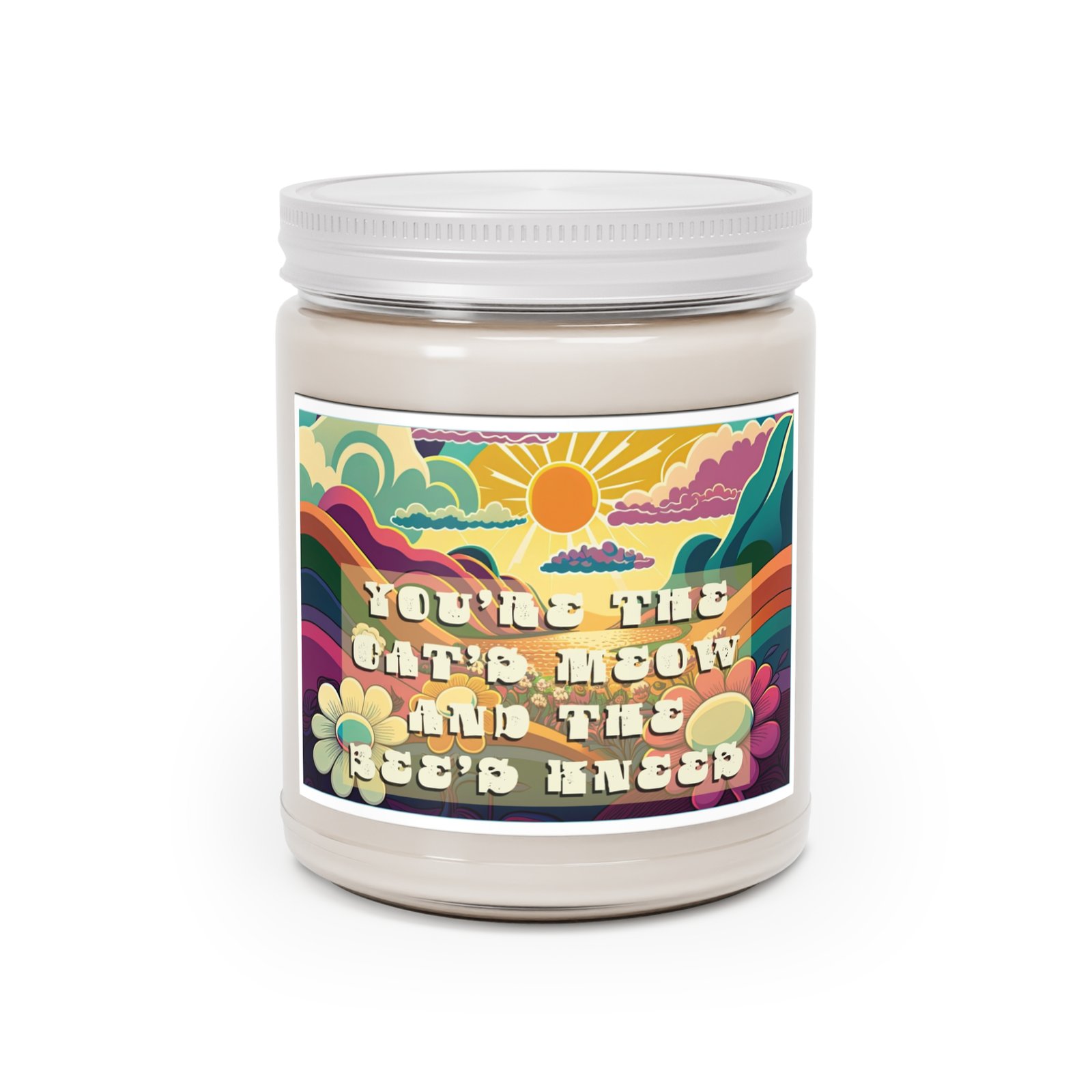 A candle that compliments you just right. This hand-poured 9 oz soy candle is wrapped in a psychedelic garden of joy — bold blooms, rolling hills, and a radiant sunbeam sky — all anchored by a retro affirmation that celebrates your sparkle: You’re the Cat’s Meow and the Bee’s Knees.
