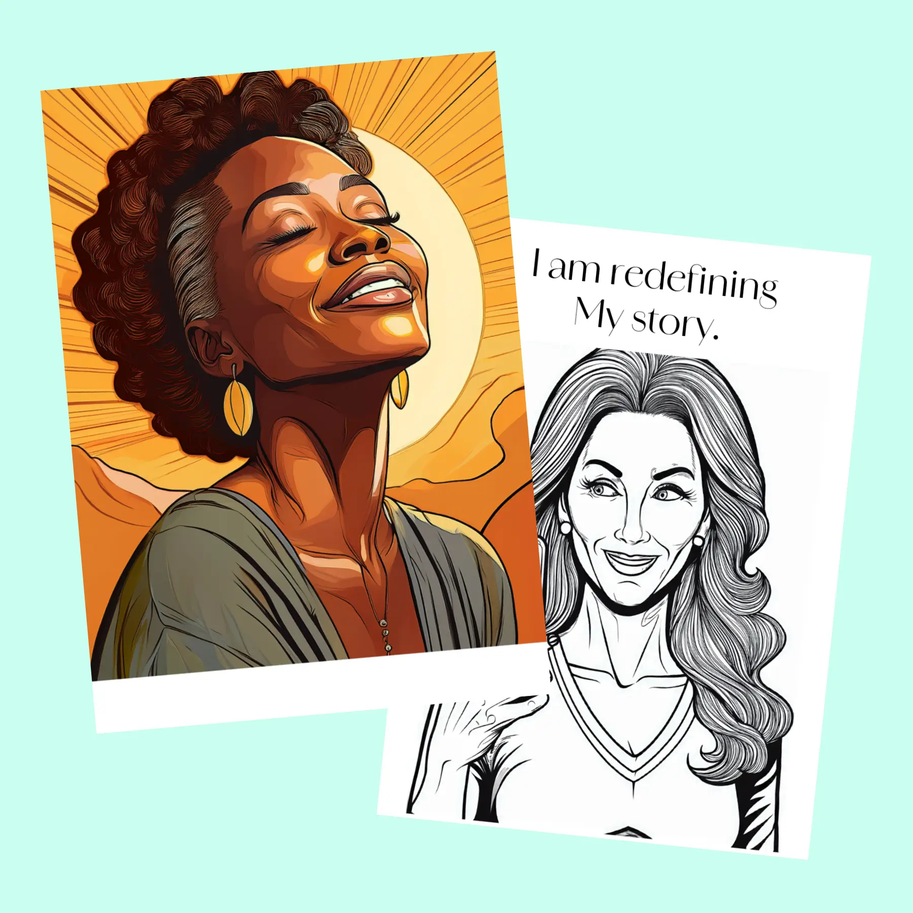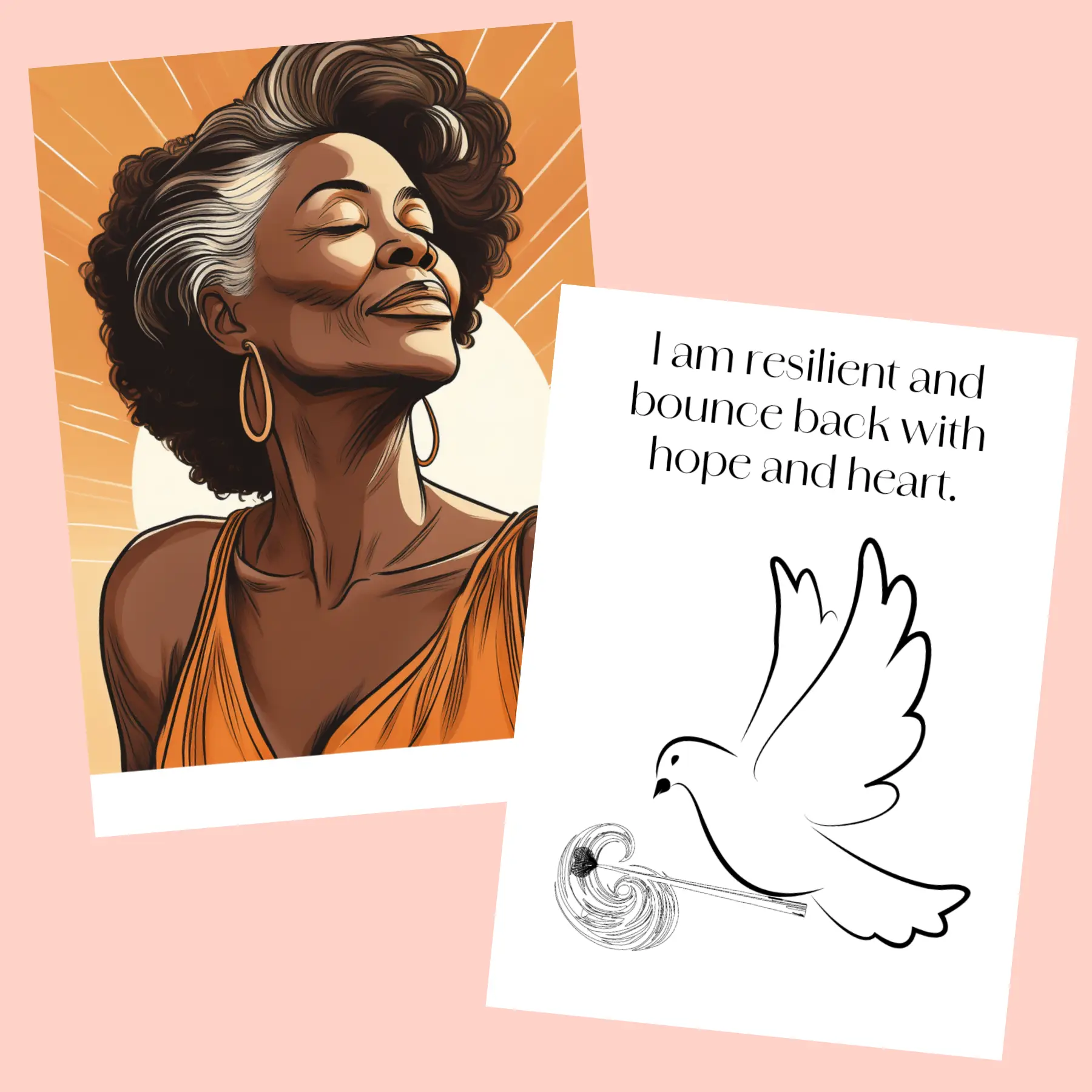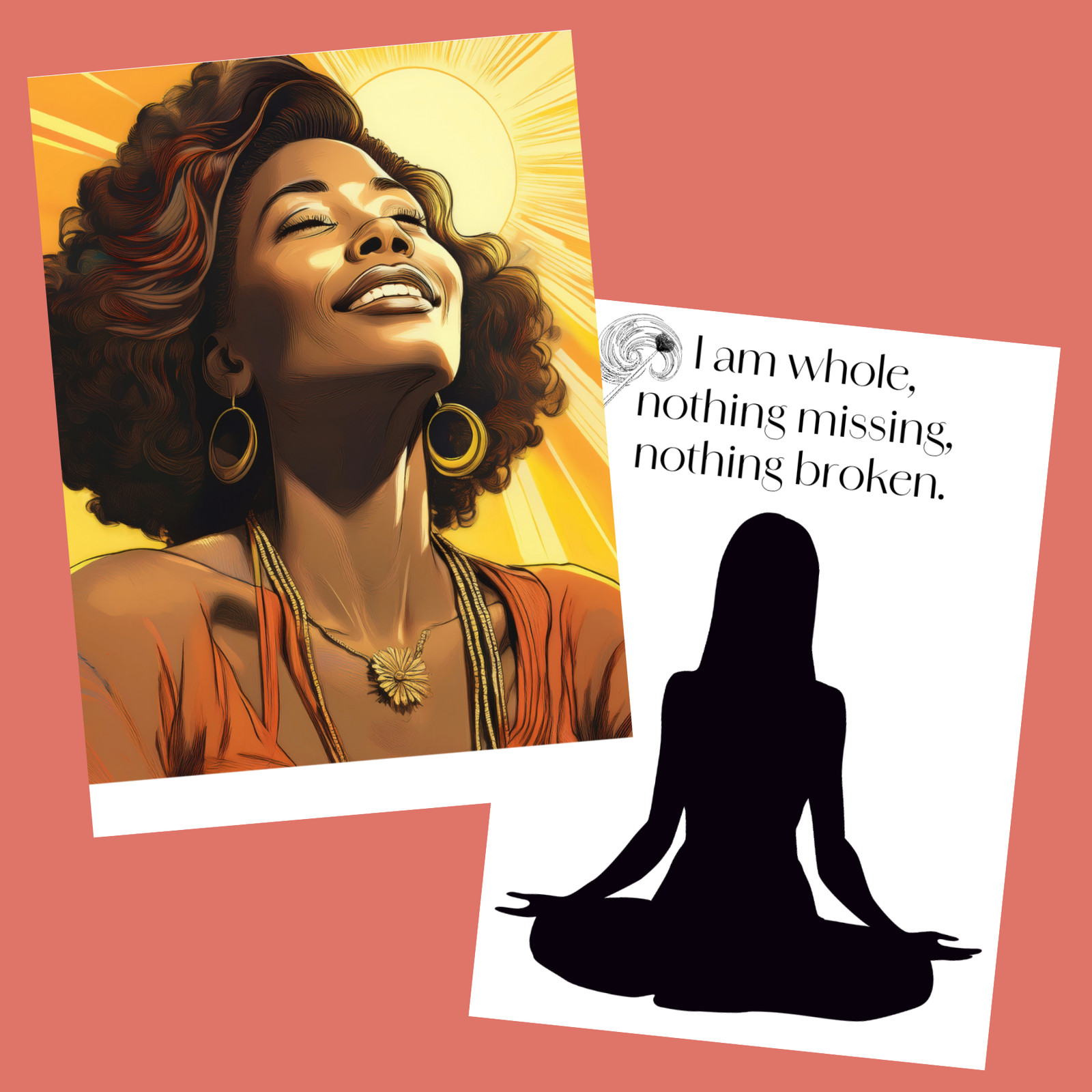 Each card features a soulful affirmation paired with expressive portrait art—designed to reflect the many faces of resilience, softness, and strength. The deck is formatted as a single-page printable, making it easy to trim, tuck into a journal, or display in your sacred space.
